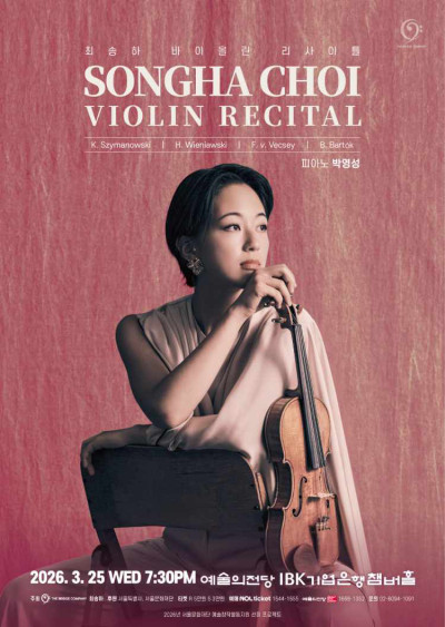 최송하 바이올린 리사이틀기간2026-03-25(수)시간19:30장소IBK기업은행챔버홀입장연령초등학생 이상관람시간(분)100가격R석 50,000원 / S석 30,000원주최(주)더브릿지컴퍼니, 최송하주관(주)더브릿지컴퍼니, 최송하후원서울특별시, 서울문화재단문의…