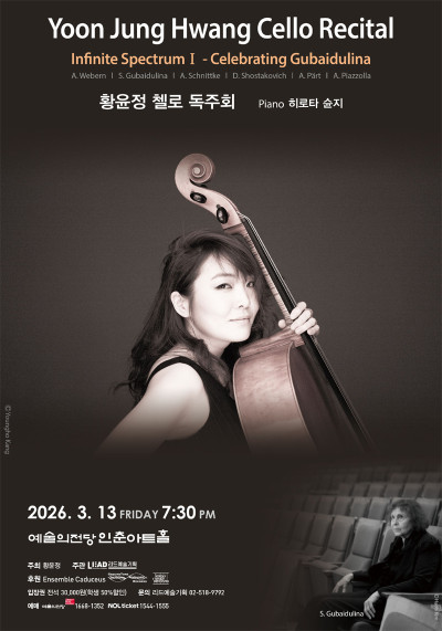 Infinite Spectrum 1 - Celebrating Gubaidulina황윤정 첼로 독주회기간2026-03-13(금)시간19:30장소인춘아트홀입장연령초등학생 이상관람시간(분)95가격일반석 30,000원주최황윤정주관리드예술기획후원Ensemble Caduceus,…