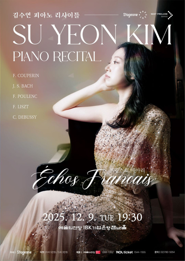 Échos Français 프랑스의 메아리 김수연 피아노 리사이틀 기간 2025-12-09(화) 시간 19:30 장소 IBK기업은행챔버홀 입장연령 초등학생 이상 관람시간(분) 105 가격 R석 50,000원 / S석 30,000원 주최 (주)스테이지원 …