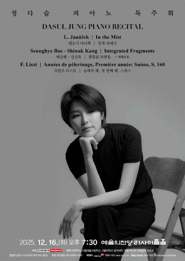 정다슬 피아노 독주회 기간 2025-12-16(화) 시간 19:30 장소 리사이틀홀 입장연령 초등학생 이상 관람시간(분) 90 가격 일반석 40,000원 주최 예인예술기획 후원 예원학교, 서울예술고등학교, 서울대학교 음악대학, 독일 하노버 국립…