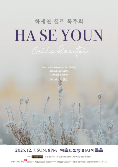 하세연 첼로 독주회 2025. 12. 7. (일) 오후 8시 예술의전당 리사이틀홀 기간 2025-12-07(일) 시간 20:00 장소 리사이틀홀 입장연령 초등학생 이상 관람시간(분) 90 가격…