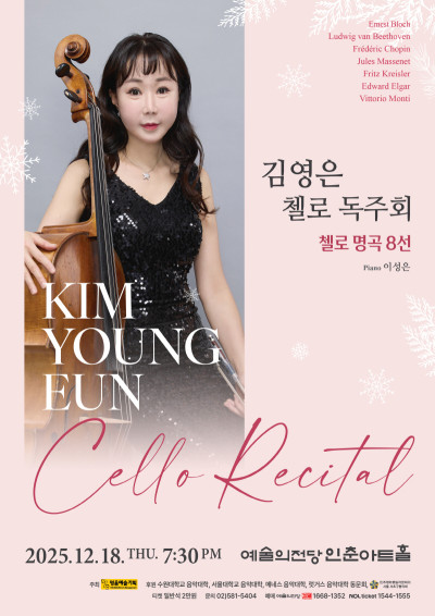 첼로 명곡 8선 김영은 첼로 독주회 기간 2025-12-18(목) 시간 19:30 장소 인춘아트홀 입장연령 초등학생 이상 관람시간(분) 90 가격 일반석 20,000원 주최 영음예술기획 후원 수원대학교 음악대학, 서울대학교 음악대학, 메네스 …