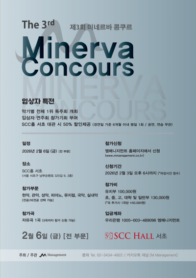 제3회 미네르바 콩쿠르 일정 : 2026년 2월 6일 금요일 [전 부문]장소 : SCC홀 서초 (서초구 남부순환로 325길 9, 3층) [입상자 특전]-악기별 전체1위 독주회 개최-입상자 연주회 참가기회 부여-SCC홀 서초 대관 시 50% …