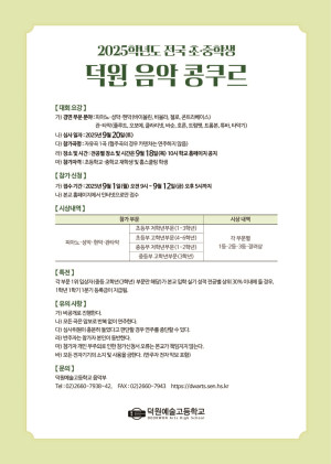 2025학년도 전국 초․중학생 덕원 음악 콩쿠르1.대회 요강가)경연 부문 분야:피아노・성악・현악(바이올린,비올라,첼로,콘트라베이스)관・타악(플루트,오보에,클라리넷,바순,호른,트럼펫,트롬본,튜바,타악기)나)심사일자:2025년9월20일(토)다)참가곡명:자유곡1곡(협주곡의 경우 카덴차는 연주하지 않음)라)장소 및 시간:전공별 장소 및 시간은9월18일(목) 10시 학교 홈페이지 공지마)참가자격:초등학교․중학교 재학생 및 홈스쿨링 학생2.참가 신청가)접수기간:2025년9월1일(월)오전9시~ 9월12일(금)오후5시까지나)접수방법:인터넷 접수만…