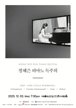 제목 2025 정혜은 피아노 독주회 “Eine stille Widmung” – 12월 3일 인춘아트홀 연주자 소개 정혜은(피아니스트) 한양대학교 음악대학 피아노과 우등 졸업 독일 슈투트가르트 국립음대 석사(MM) 및 최고연주자과정(KE) 최고점수 졸업 국내외 다수 콩쿠르 입상 (국가보훈문화예술협회, 부산광역시 교육청 등) 13세 헝가리 데브레첸 필하모니 오케스트라 데뷔 독일 슈투트가르트 필하모니 오케스트라 협연 유럽 다수 초청 독주회 및 페스티벌 참가 국내 주요 공연장 독주회 및 실내악 연주 다수 후학 …