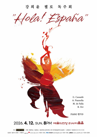 "Hola! España"강희윤 첼로 독주회기간2026-04-12(일)시간20:00장소리사이틀홀입장연령초등학생 이상관람시간(분)90가격일반석 20,000원주최지클레프후원예원학교, 서울예고, 서울대학교 음악대학, 영국 북부왕립음악원 동문회문의지클레프 02-515-5123…