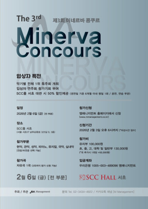 제3회 미네르바 콩쿠르일정 : 2026년 2월 6일 금요일 [전 부문]장소 : SCC홀 서초 (서초구 남부순환로 325길 9, 3층)[입상자 특전]-악기별 전체1위 독주회 개최-입상자 연주회 참가기회 부여-SCC홀 서초 대관 시 50% 할인제공 (경연일 기준 6개월 이내 평일 1회 / 공연,연습 무관)신청기간 : 2026년 2월 3일 오후 6시까지 [*마감시간 엄수]참가부문 : 현악, 관악, 성악, 피아노, 뮤지컬(개인/단체), 국악, 실내악 [전공/비전공 선택 가능]참가곡 : 자유곡 1곡 (3곡까지 참가 신청 가능) *2곡 이상 …
